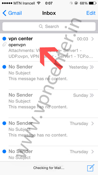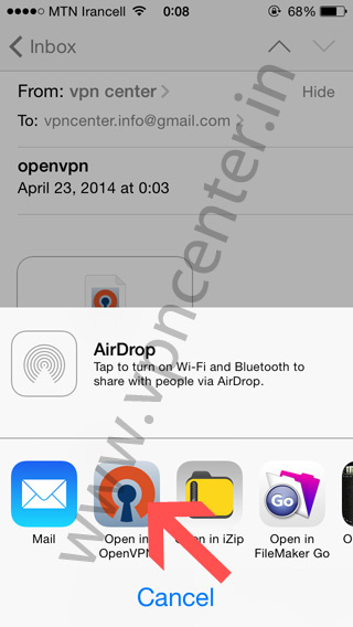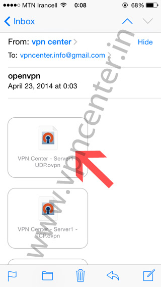 ۲- فایل تنظیمات سرور را با کامپیوتر دانلود کرده و بعد از خارج کردن از حالت زیپ آن را به ایمیل خود ضمیمه و ارسال کنید. سپس با نرم افزار Mail خود گوشی، آن را باز کرده و مطابق شکل های زیرعمل کنید