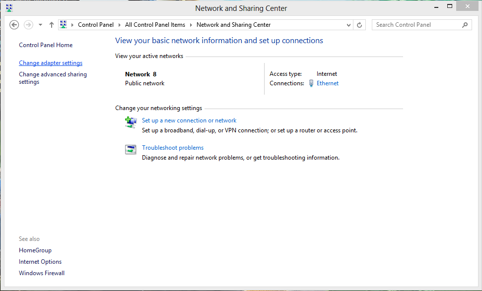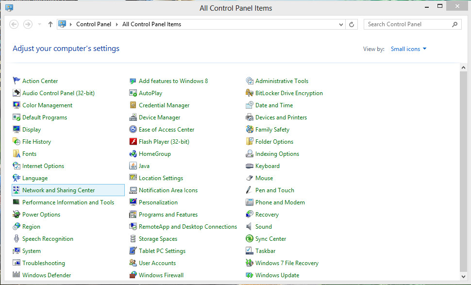 1 . به کنترل پنل رفته و مطابق شکل زیر Network and Sharing Center را باز کنید .