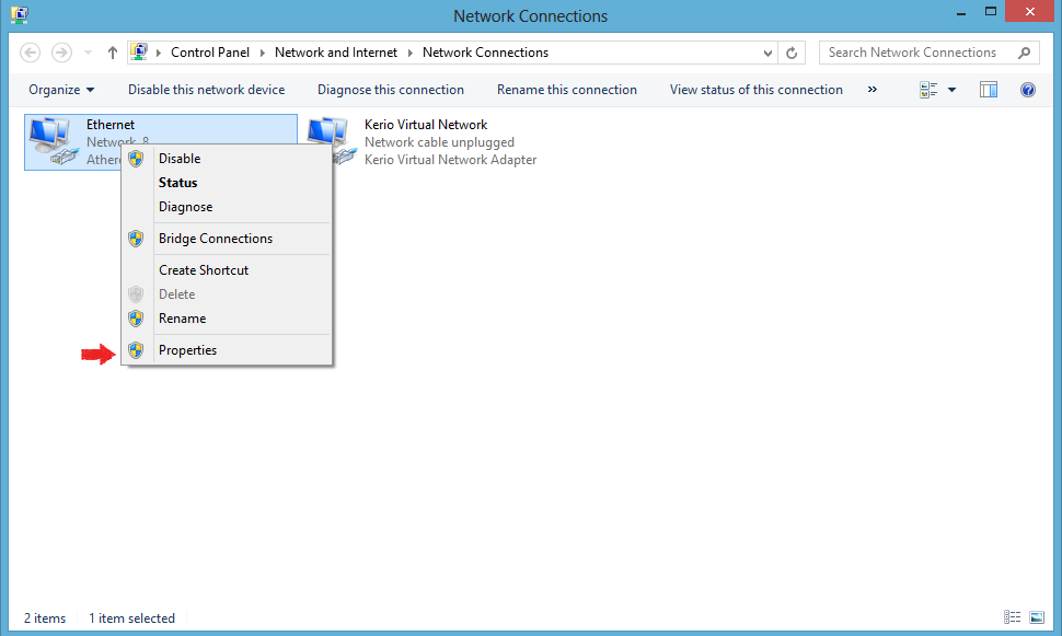 3 . روی آداپتری که با اون به اینترنت متصل هستید راست کلیک کرده و Properties بزنید .
